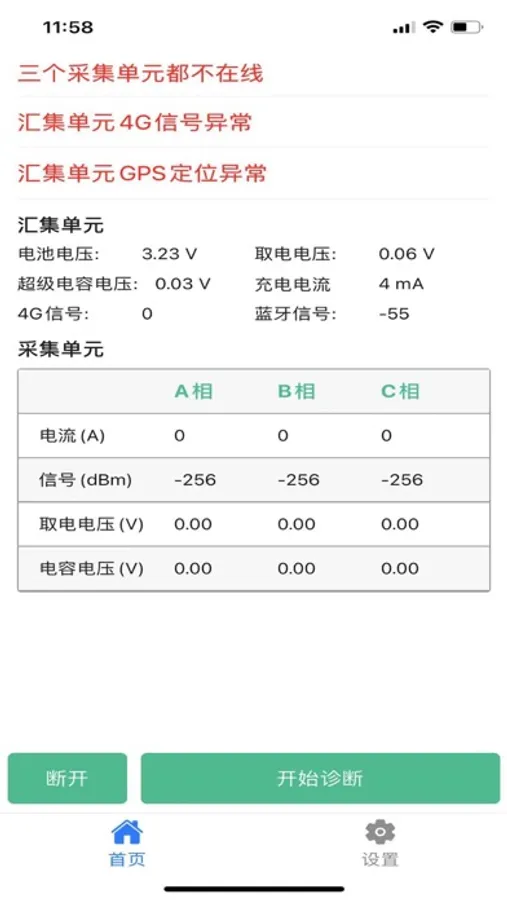 安装诊断工具,意在帮助现场安装人员准确定位所安装的设备是否正常安装,提升安装效率,减少后期消缺问题。1.当前版本仅适合于WK现场安装;2.能够准备识别WK安装后的取电是否正常,采集单元是否正常取电、上线;3.能够看到当前GPS定位状态、4G网络信号等。