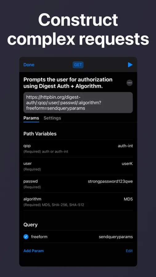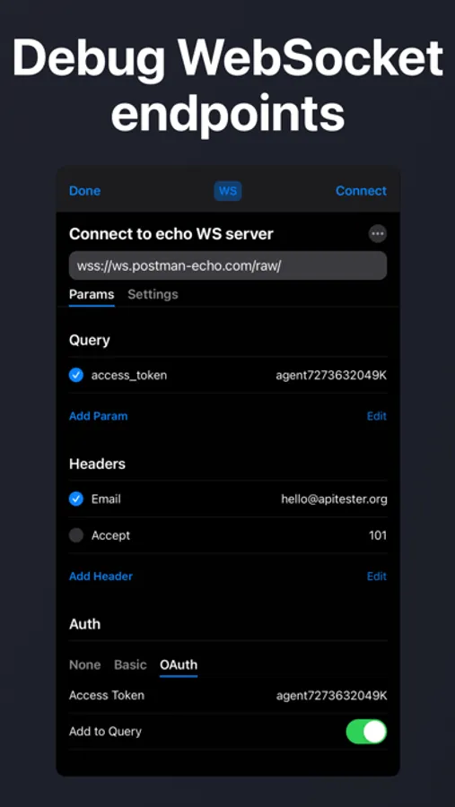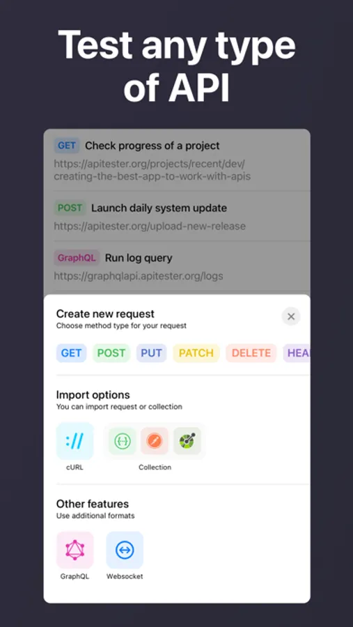 API Tester is the first mobile app to test any type of API on the go. Including REST, GraphQL, WebSocket, SOAP, JSON RPC, XML, HTTP, HTTPS.