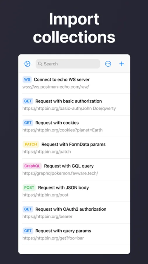 - Import request or collection by curl, link or file from your device. And naturally, there is any type of collection for you: Swagger, OpenAPI, Postman, YAML.