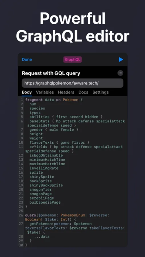 - Powerful GraphQL editor with full-scale experience: body editor with Queries, Mutations, Subscriptions and syntax support; variables editor; documentation explorer; request settings and metadata.