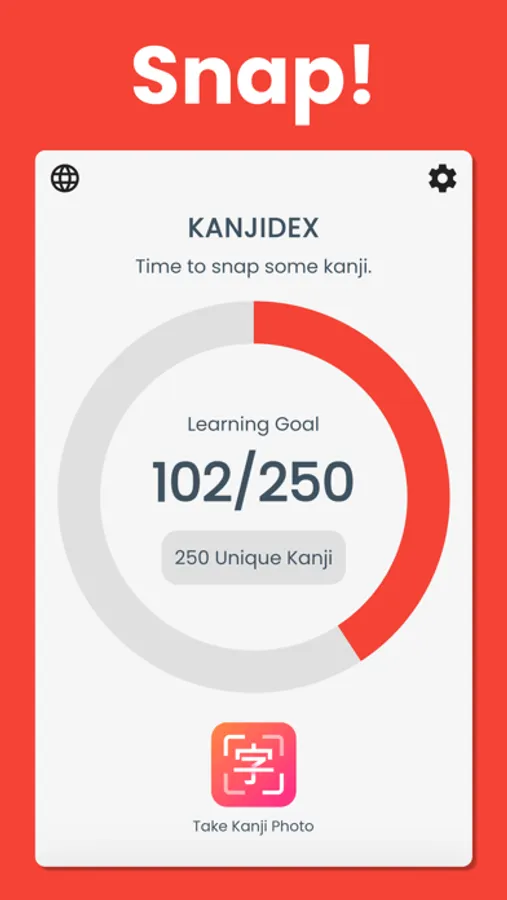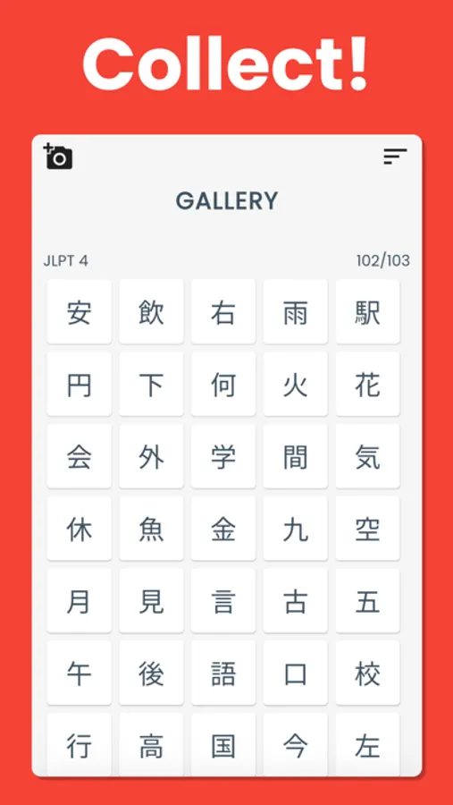 Kanjidex is all about collecting the kanji by taking pictures of them in real life.