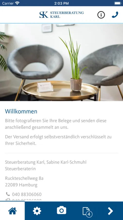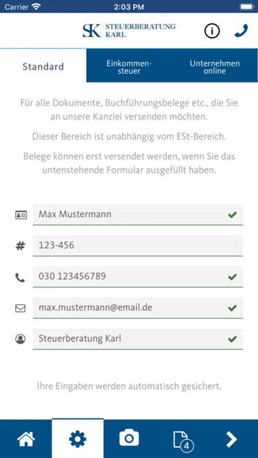 Mithilfe dieser App können Sie Belege, Dokumente und andere Schriftstücke schnell, sicher und komfortabel an Steuerberatung Karl gesendet werden.
