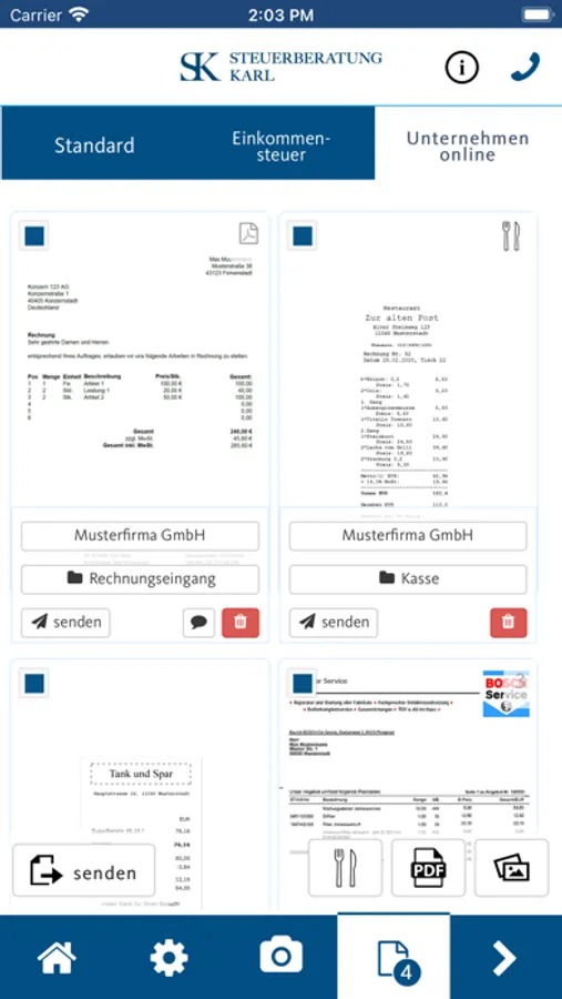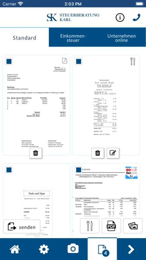 Machen Sie einfach ein oder mehrere Fotos von Ihren Belegen und versenden Sie diese mit einem Klick direkt aus der App heraus an Steuerberatung Karl