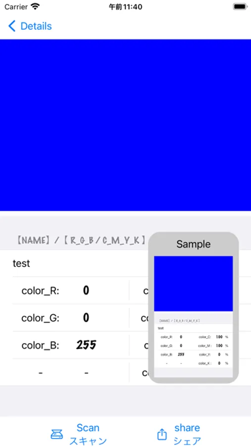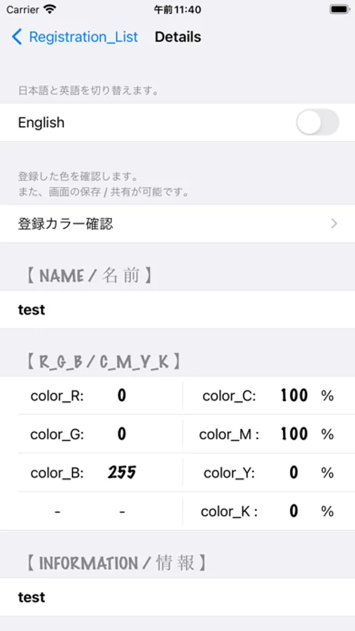 オリジナルカラーの件名、R_G_B値、C_M_Y(K)値等が登録可能で、画像登録やシェア機能を追加致しました。
