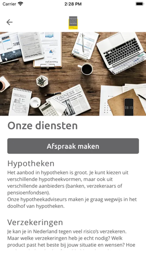 Altijd advies op maat, voor particuliere en zakelijke relaties. Met behulp van deze app komt u nog makkelijker in contact met een van onze adviseurs. Daarbij kunt u ook gemakkelijk uw stukken aanleveren ter documentatie.