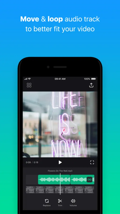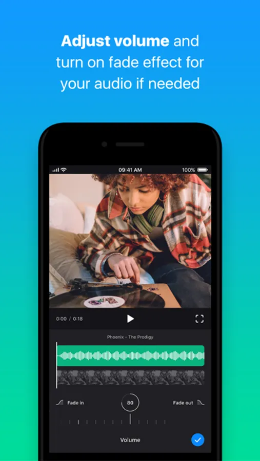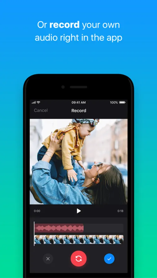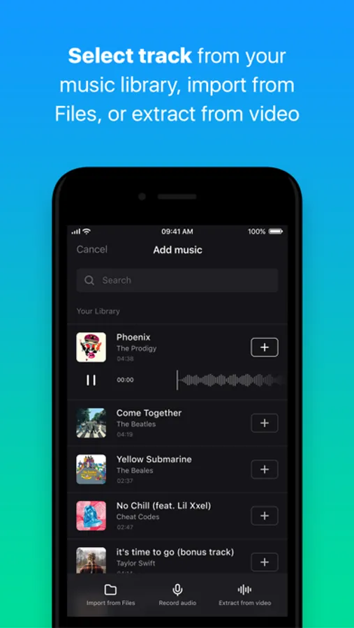 Video Music Adder by Clideo allows not only uploading a soundtrack from your Library or iTunes, but also recording your own sound or extracting audio from any video.