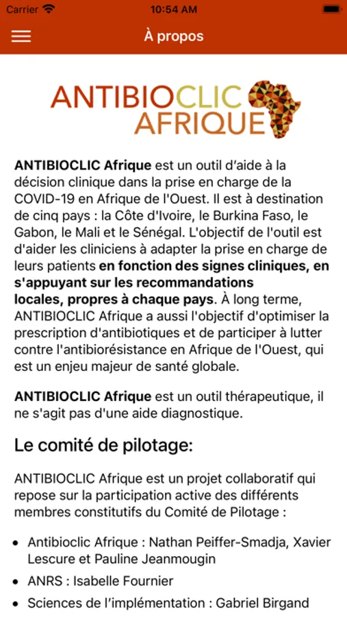 Antibioclic Afrique est un outil d’aide à la décision clinique dans la prise en charge de la COVID-19 en Afrique de l'Ouest. Il est à destination de cinq pays : la Côte d'Ivoire, le Burkina Faso, le Gabon, le Mali et le Sénégal. L'objectif de l'outil est d'aider les cliniciens à adapter la prise en charge de leurs patients en fonction des signes cliniques, en s'appuyant sur les recommandations locales, propres à chaque pays. À long terme, Antibioclic Afrique a aussi l'objectif d'optimiser la prescription d'antibiotiques et de participer à lutter contre l'antibiorésistance en Afrique de l'Ouest, qui est un enjeu majeur de santé globale.