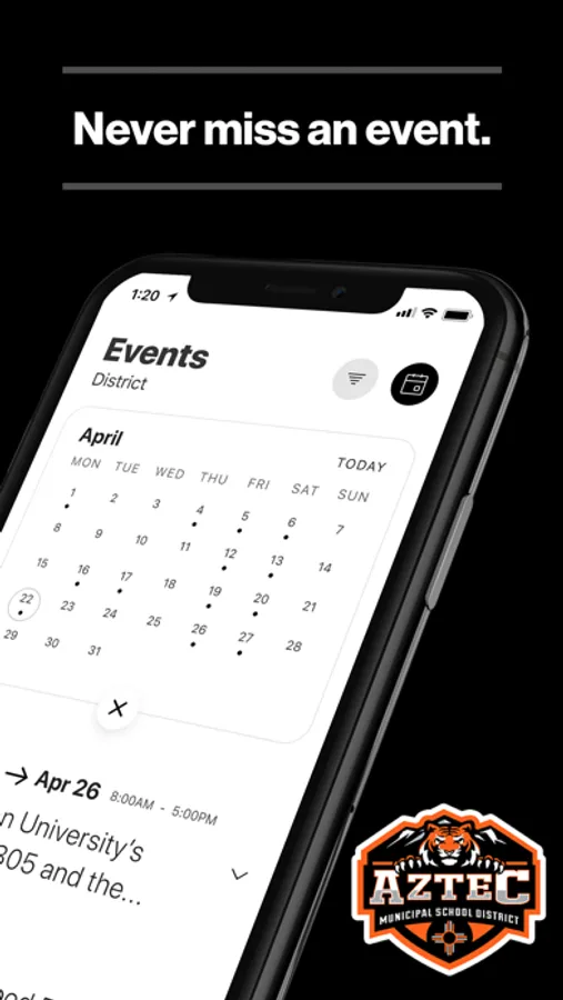 The event section shows a list of events throughout the district. Users can add an event to your calendar to share the event with friends and family with one tap.