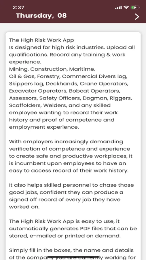 Is designed for high risk industries. Upload all qualifications. Record any training & work experience.