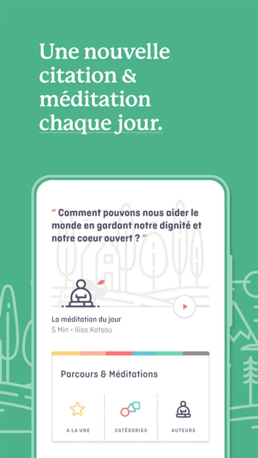 Bénéficiez d’une inspiration quotidienne grâce à une méditation différente chaque matin : la méditation du jour. Elle est liée à une citation se conclut par une invitation concrète pour garder la pratique vivante une fois le coussin rangé dans l’armoire.