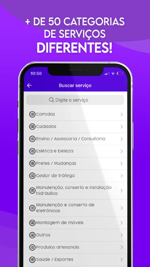 Crie uma conta, procure o serviço que deseja e entre em contato com o prestador por meio do chat individual do app.
