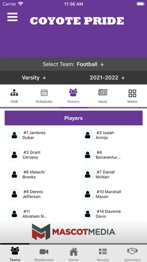 - Rosters: Current rosters by sport including jersey number, name, photo, position and grade.