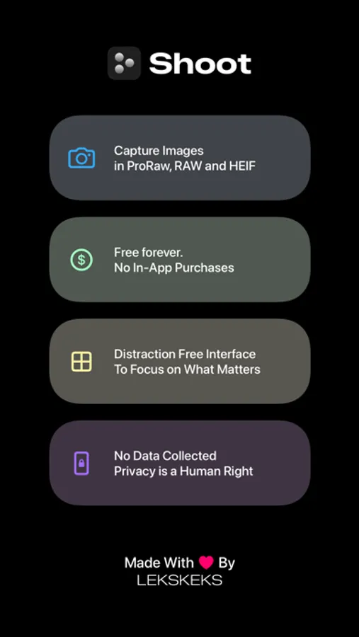 The app is free, and has no additional in-app purchases. We believe that privacy is a fundamental human right and we built Shoot with that in mind: we don't collect any data, so what happens on your phone stays on your phone.