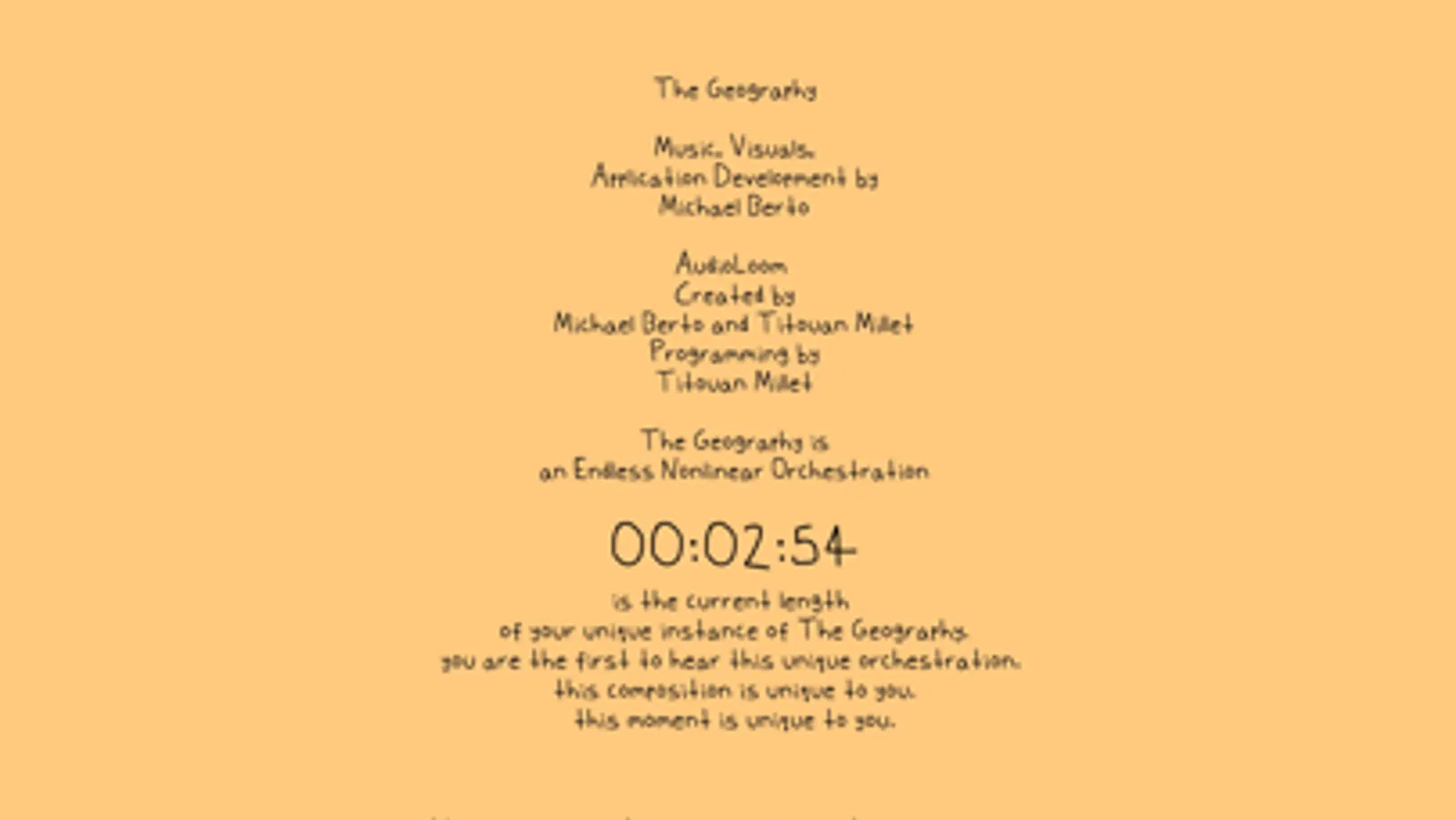 The Geography is an Endless, Nonlinear Musical Composition, unique to every instance of The Geography, with music and compositional orchestration by Michael.