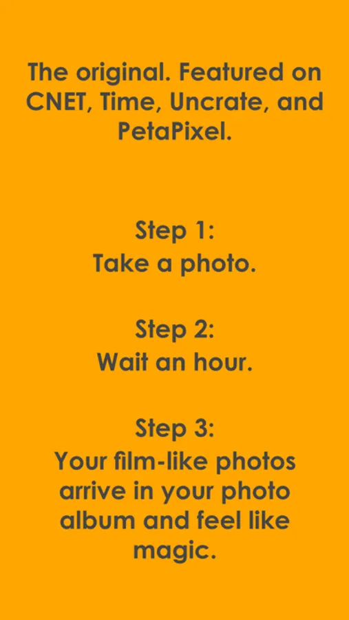 1 Hour Photo brings a surprising new experience to mobile photography - it makes all your shots more magical by making you wait an hour before you get to see the results (using our gorgeous, proprietary film emulations).