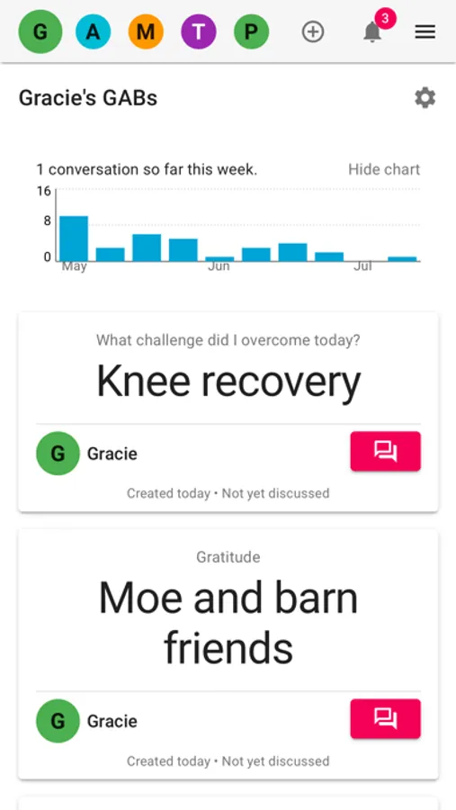 One tap marks that a GAB has been discussed. You can see at a glance how many conversations you're having and how frequently, week by week.