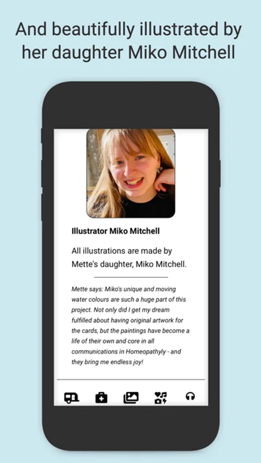 The app is designed and developed by homeopath Mette Mitchell who has a wealth of experience in teaching families how to use homeopathy at home safely. The beautiful water colour illustrations were created by Miko Mitchell.