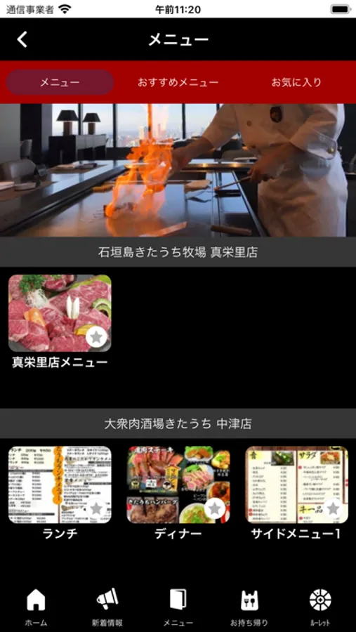 肉卸直営 大衆肉酒場きたうち 中津店、塊肉 石窯焼 肉’s Kitchen きたうち 東大阪長田店、石垣島きたうち牧場 真栄里店の3店舗のメニューを掲載しております。