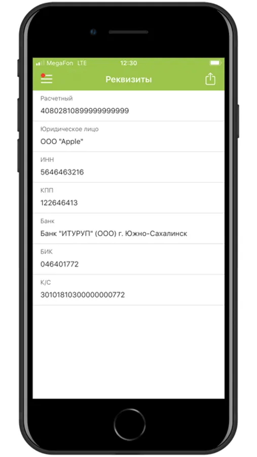 — просмотр реквизитов банковских счетов организации и передача их с помощью различных каналов и приложений, доступных на мобильном устройстве;