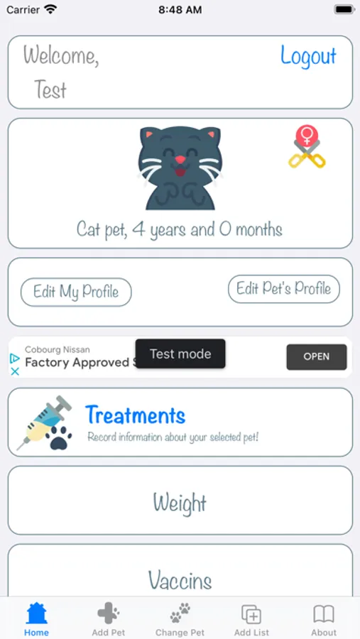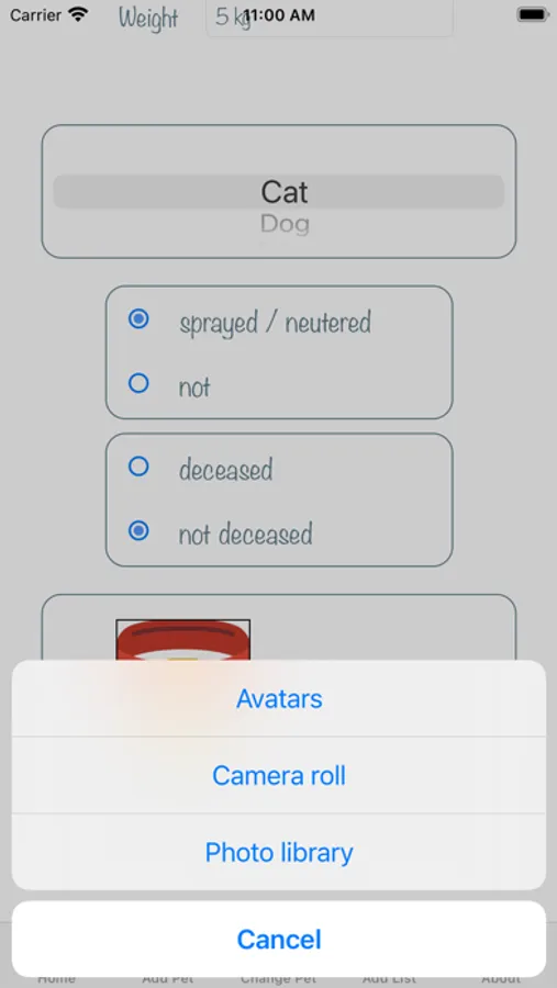 It allows you to choose between cat, dog, or others. You can choose an avatar, an image from gallery, or take a picture of your pet. Also, you can have multiple pet profiles.