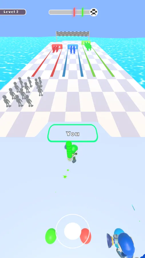 Collect chunks of your own color, throw the chunks to dummies to get units to push the bar over to the other side.