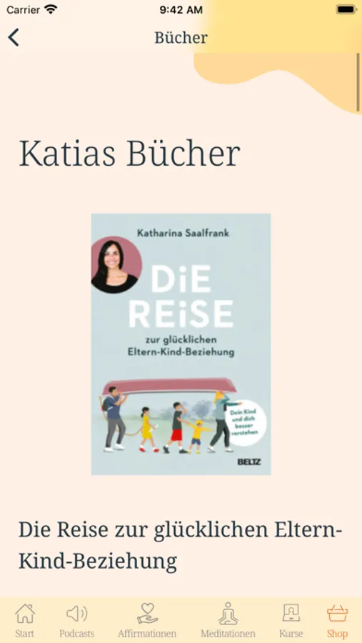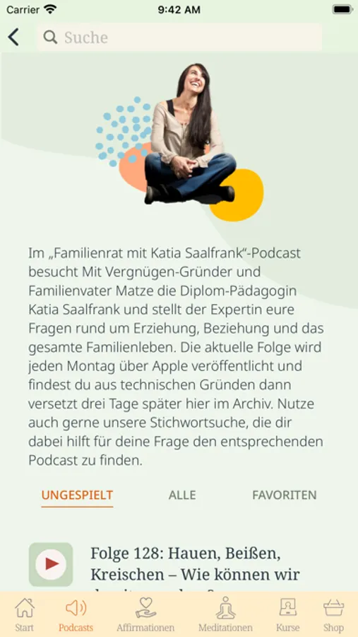 In dieser App von Katia Saalfrank findest du ausgewählte und von Katia selbst erstellte bindungs- und beziehungsorientierte Inhalte (Hördateien, Meditationen, exklusive Podcasts), die dir helfen, in Verbindung zu dir selbst und deinem Kind zu bleiben und dich bei der Gestaltung einer konstruktiven Beziehung unterstützen. Die wertvollen Inhalte in der App werden laufend ergänzt, so dass du immer wieder neuen Content von Katia finden wirst. Die App ist auch interaktiv angelegt, du kannst dir z.B. Affirmationen in dein Familienleben schicken lassen. So ist die App für DICH mit viel Liebe zum Detail gestaltet und voller Hingabe mit wertvollen Inhalten gefüllt.