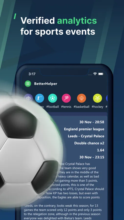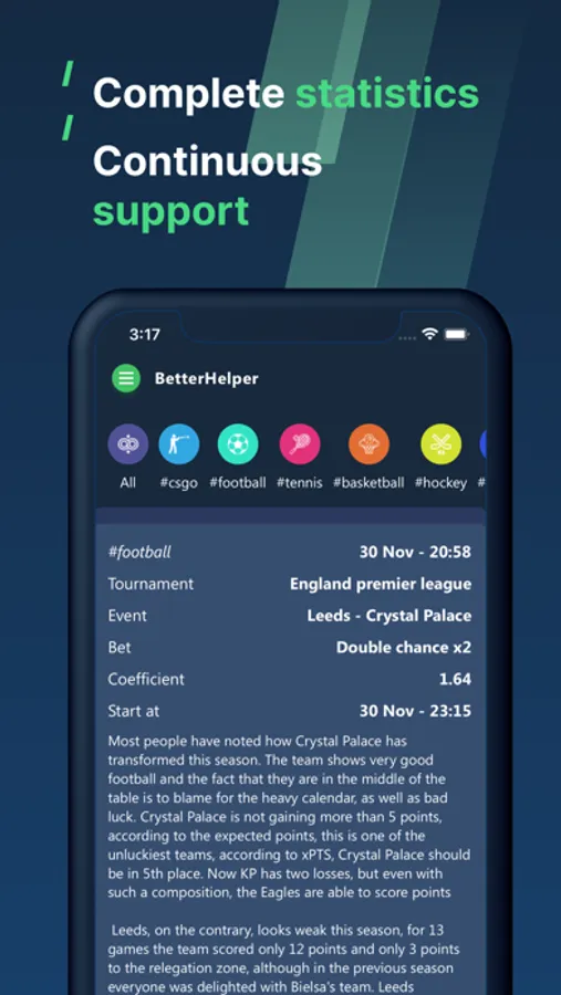 The application provides verified analytics of sports events. But we warn you that the information and all functions are presented solely for information.