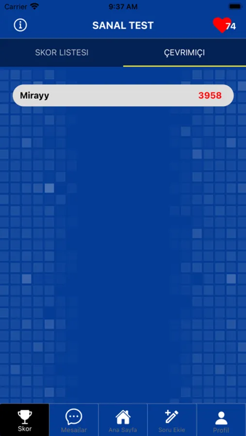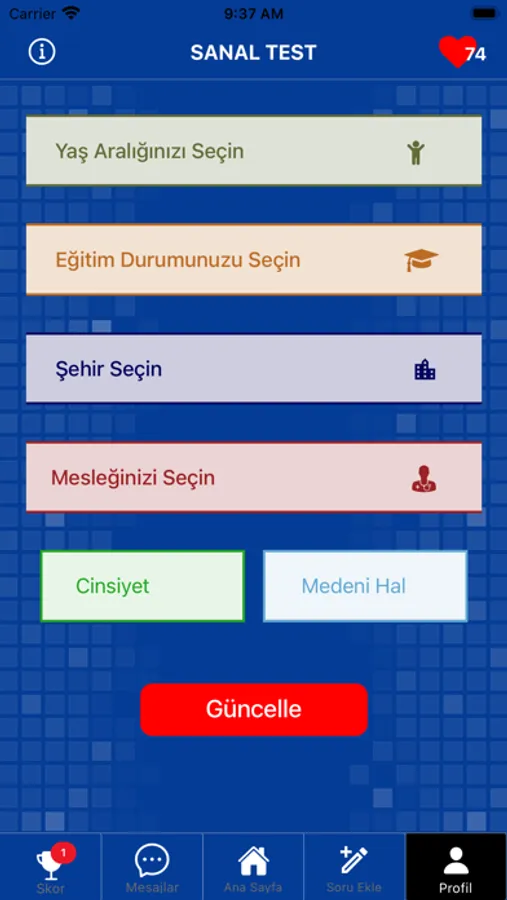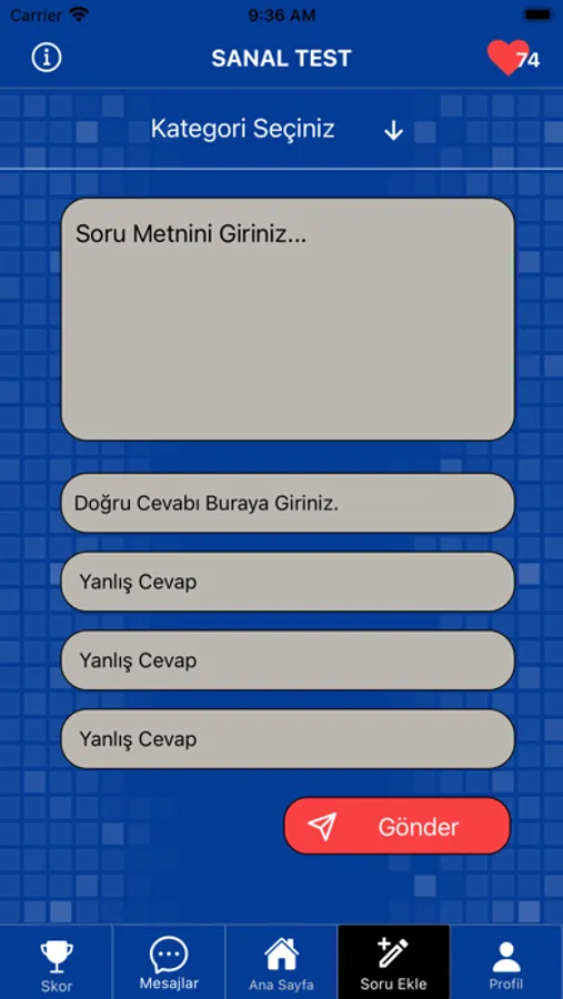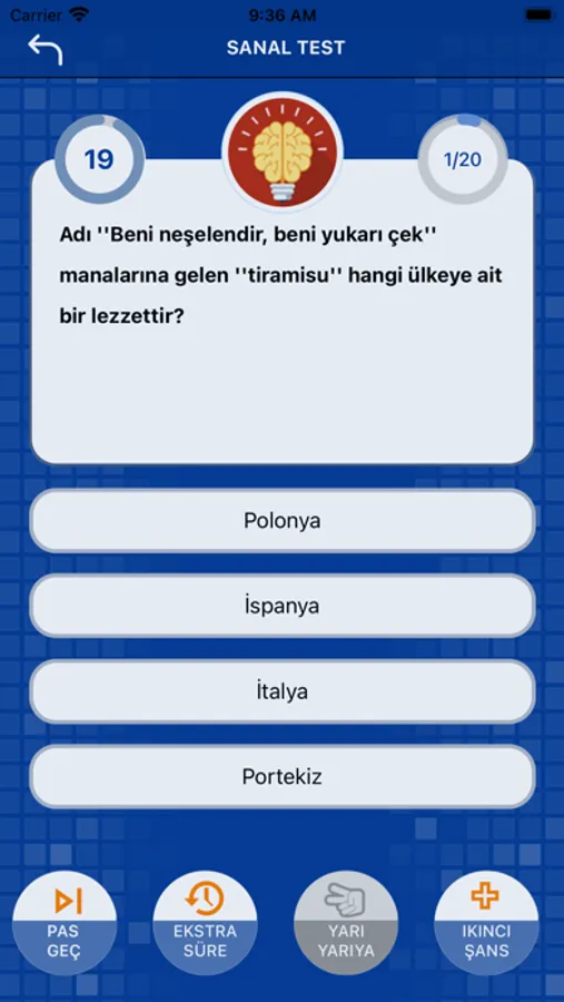 Sanal Test Ödüllü Bilgi Yarışması ile bilginizi test edin. Genel Kültür, Tarih, Coğrafya, Müzik, Spor, Edebiyat kategorilerinde on binlerce soru. Tüm sorular zorluk derecesine göre ayarlanmıştır. Her soru için 20 saniye süreniz bulunmaktadır. Pas, Yarı Yarıya gibi toplamda 4 Joker hakkınız bulunmaktadır. Sorular ilerledikçe daha zor hale gelmektedir. Genel bilgi birikiminizi denemek için eğlenceli ve kolay bir deneyim sunar.