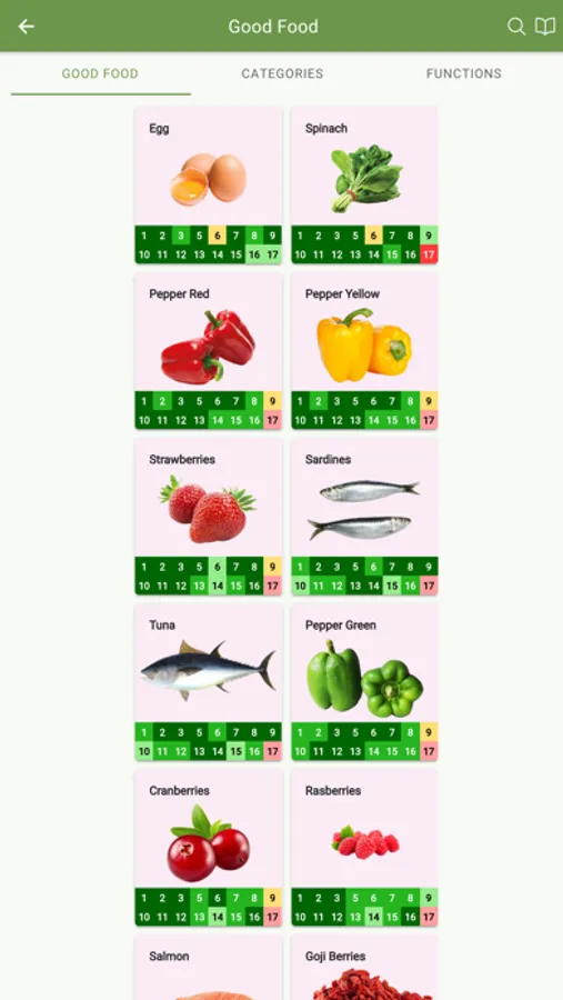 Enter our application and learn about all the foods and the benefits they offer to our body. See in detail the nutrients, vitamins and trace elements that contain basic food categories that our diet includes such as cereals, vegetables, fruits, dairy, meat, fish, seafood, legumes, nuts, oils and many more.