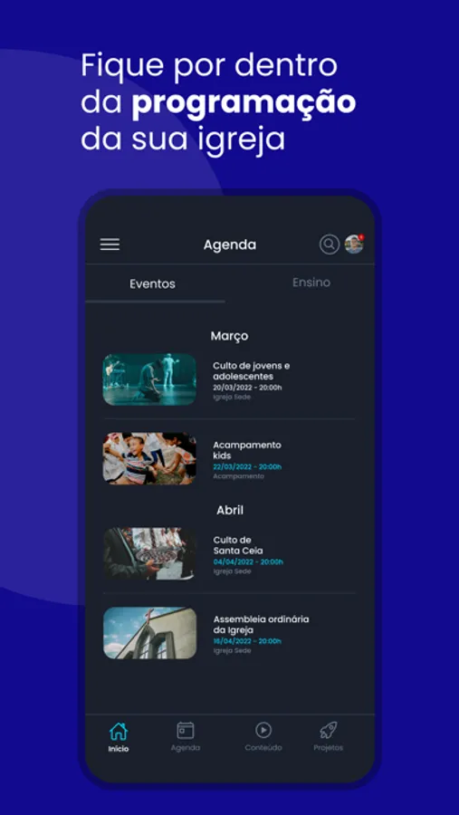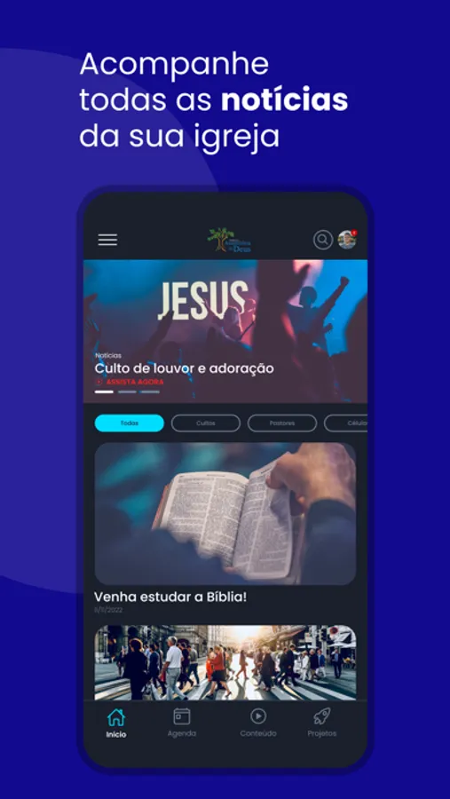 Recursos disponíveis no Aplicativo: Notícias, Agenda da igreja, Eventos, Conteúdos, Projetos, Transmissão ao Vivo e Módulo Ensino.