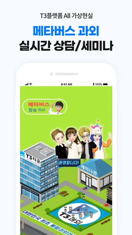 “메타버스 탑승Go”라는 가상현실 공간 맵을 제작하여 T3과외플랫폼에 대한 자세한 정보 안내와 과외상담, 입시컨설팅, 세미나개최 등 다양한 교육정보를 함께 공유할 수 있고, 본인의 아바타를 통해 전국의 많은 회원들과 실시간 소통할 수 있는 과외업계 최초로 제작된 가상세계 체험공간입니다.