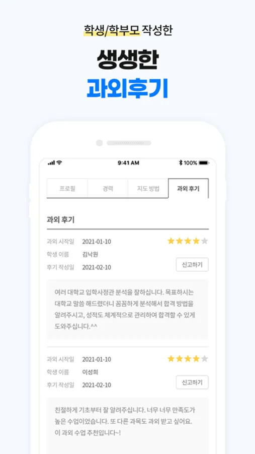 모든 과외수업이 종료되면 모든 학부모와 학생은 과외선생님에 대해 과외후기를 등록할 할 수 있습니다.