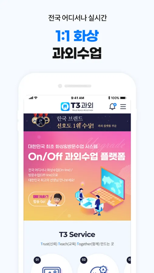 별도의 프로그램 설치 없이 T3플랫폼 안에서 실시간 1:1화상과외 수업방식과 선생님이 직접 방문하여 1:1대면과외 수업방식으로 수업이 가능하므로, 학생의 교육환경과 성향을 고려하여 학생이 원하는 수업방식으로 실시간 수업이 가능합니다.