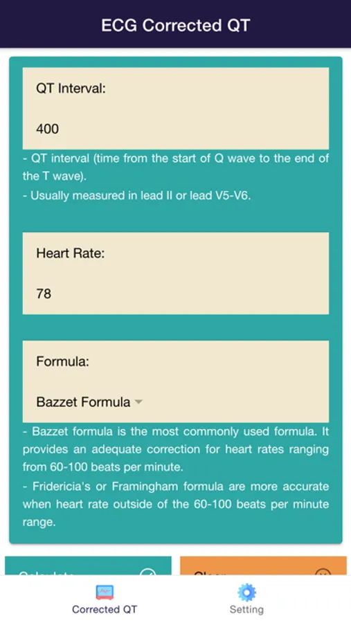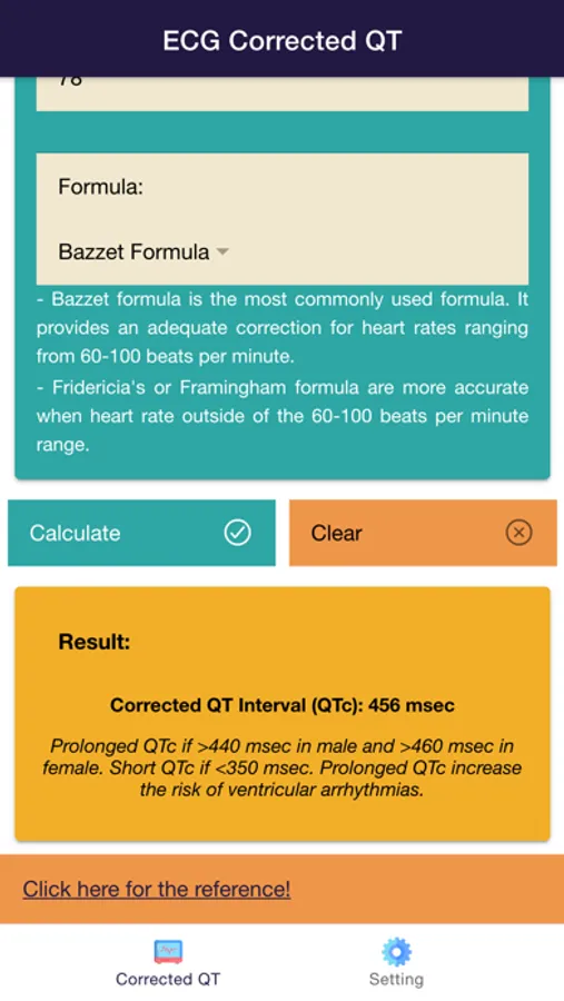 The QT interval is affected by heart rates, so we need to calculate the corrected QT interval (QTc). The corrected QT interval (QTc) will estimate the QT interval at a heart rate of 60 beats per minute. Prolonged corrected QT interval (QTc) is associated with ventricular arrhythmias, especially Torsades de Pointes. "ECG - Corrected QT Interval: Electrocardiogram Rhythm App" app is a practical medical calculator to calculate the corrected QT interval (QTc). In "ECG - Corrected QT Interval: Electrocardiogram Rhythm App", the user need to input the QT interval (in millisecond) and heart rate (in beats per minute) to calculate the corrected QT interval (QTc). "ECG - Corrected QT Interval: Electrocardiogram Rhythm App" have three available formulas, namely Bazzet, Fredericia, and Framingham.