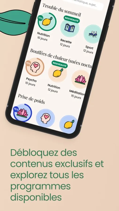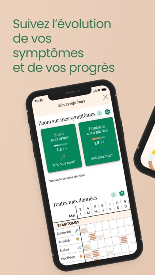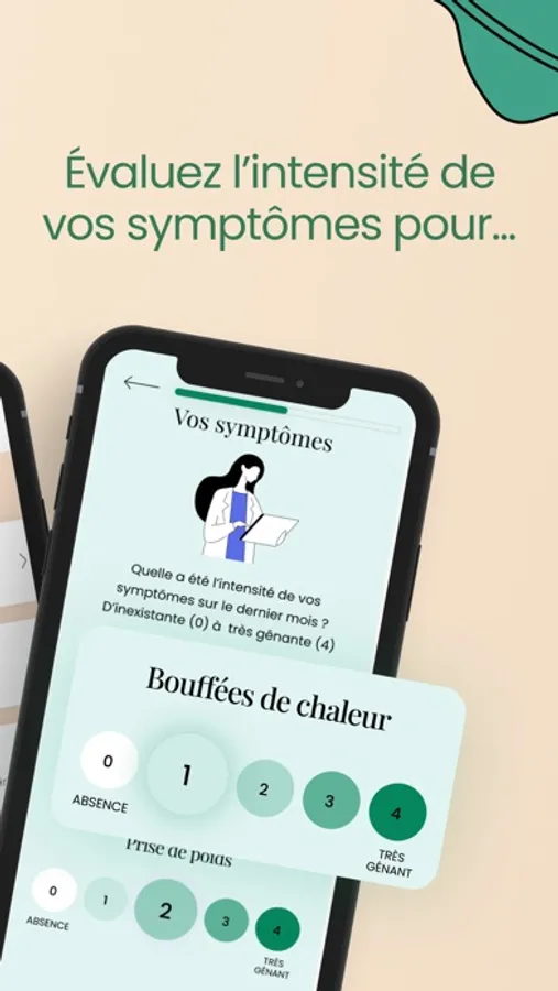 Selon votre profil, vous aurez accès à des conseils pour réduire vos symptômes de ménopause parmi 9 symptômes de ménopause les plus répandus (bouffées de chaleur, anxiété, insomnies, douleurs articulaires, prise de poids ...).