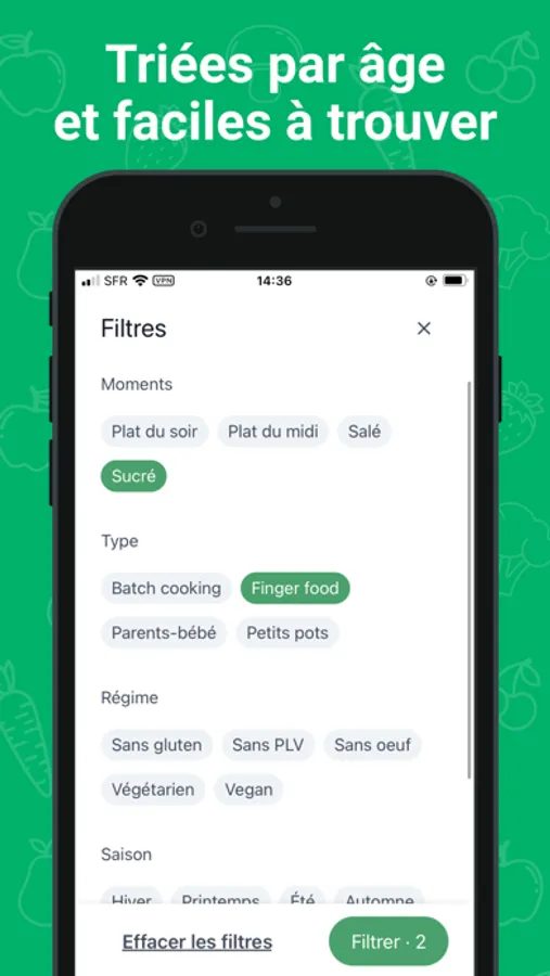 - Triez et filtrez les recettes par âge, par type, par régime alimentaire (sans viande, sans PLV, sans oeuf etc.).