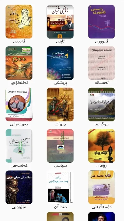 کتێبەکان لە چەند بەشێکی جیاواز پێک هاتوون وەک ( ڕۆمان ، ئایینی، مێژوو، وەرزش ، دەروونزانی ، زانستی ، پزیشکی) و چەندین جۆری تریش.