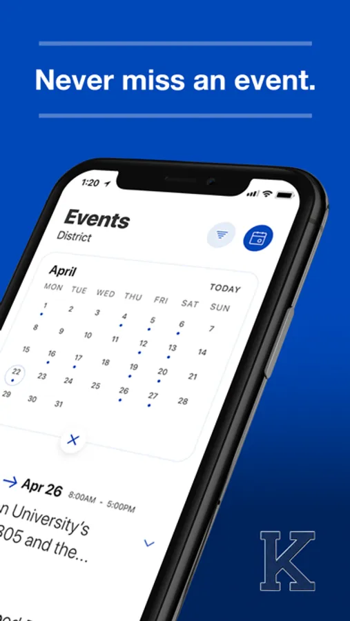 The event section shows a list of events throughout the district. Users can add an event to your calendar to share the event with friends and family with one tap.