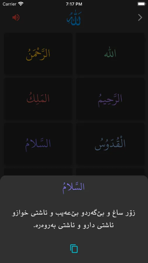 ٢- ناوەکانی خوای گەورە: 99 ناوەکانی خوای گەورە بە مانای کوردی و خوێندنەوەی بە چەند دەنگی جیاواز.