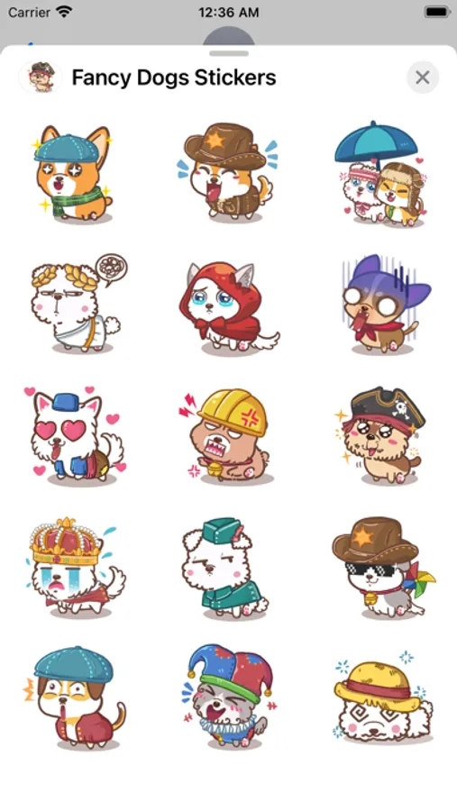 Pawsome stickers with images from the `Fancy Dogs - Puppy Collector` game of the same developer (Genix Lab).