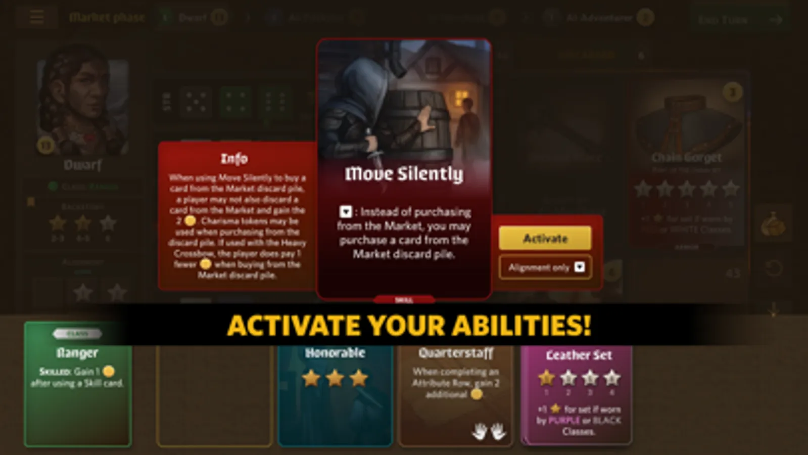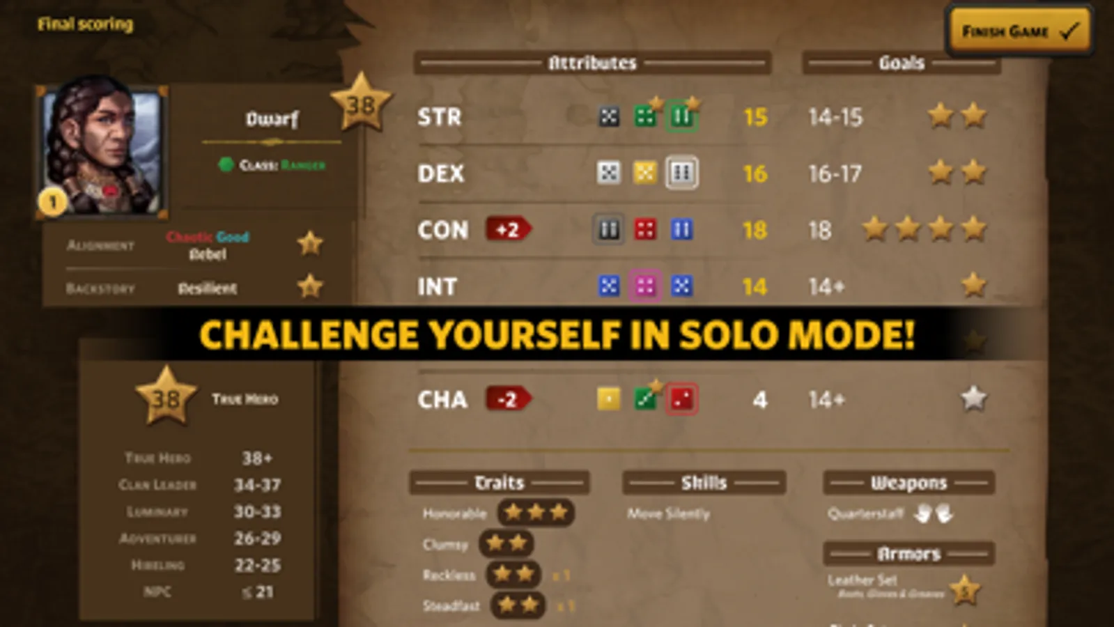 At the beginning of the game, each player is assigned a random RPG class, alignment and a backstory. Through a series of puzzle-like dice manipulations, a player optimizes their character's attributes and attempts to maximize their alignment and backstory points. Earned gold is used to purchase various skills, traits, weapons and armor in the market phase of each turn. The game ends with a fully created character sheet of an RPG character and the player whose character has the most reputation points wins the game. The best character sheets are stored in the Hall of Heroes.