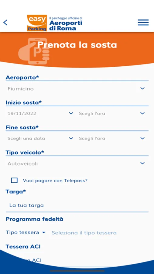easy Parking è l'app del parcheggio ufficiale di Aeroporti di Roma, che ti permette di prenotare e pagare la tua sosta negli aeroporti di Fiumicino e Ciampino in modo semplice, veloce e sicuro.