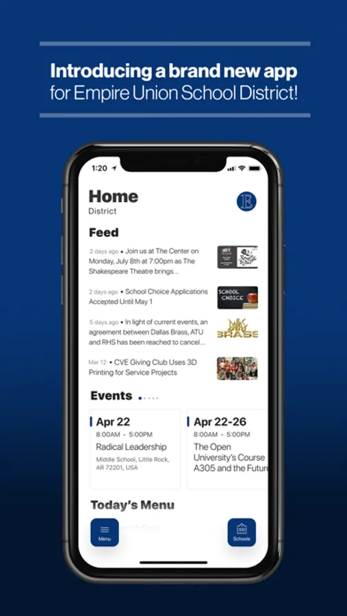 The event section shows a list of events throughout the district. Users can add an event to their calendar to share the event with friends and family with one tap.