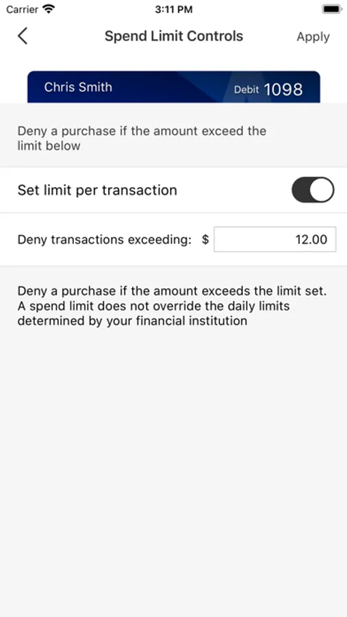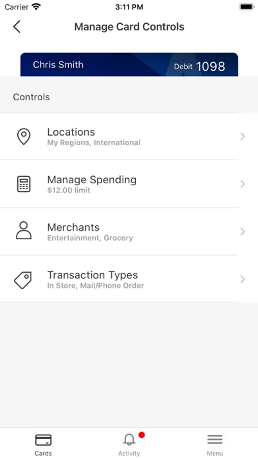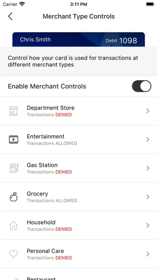 Spending limits can be established to allow transactions up to a certain dollar value and decline transactions when amounts exceed your defined thresholds. Transactions can be monitored and managed for specific merchant categories such as gas stations, department stores, restaurants entertainment, travel, and groceries. And your transactions can also be monitored for specific transaction types: in-store purchases, e-commerce transactions, mail/phone orders and ATM transactions.