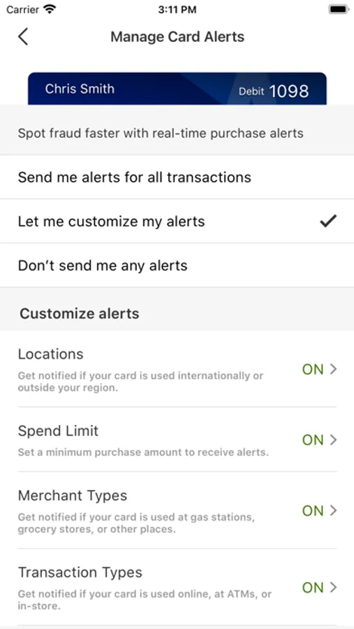 Alerts for PIN and signature transactions can be set up to keep you informed of your debit and credit card usage and help you quickly detect unauthorized or fraudulent activity. This app can send an alert when a card is used or when a card transaction has been attempted but is declined – and additional customizable alert options are available. Alerts are sent in real time, immediately after a transaction has taken place.