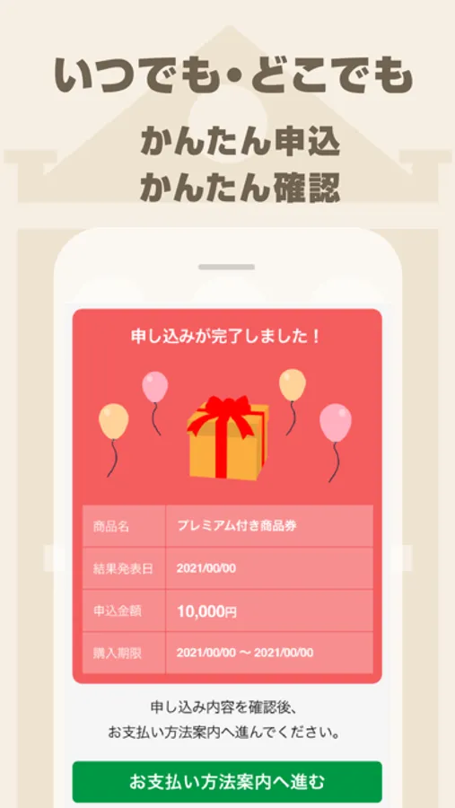 アプリ内で商品券を選択し、購入希望金額を選び申込するだけで手続き完了です。抽選結果もアプリ内で確認いただけます。