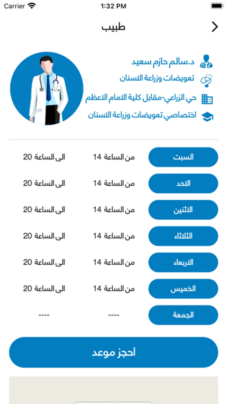 تطبيق " احجز طبيبك " تطبيق مجاني لخدمة أهلنا في مدينة الموصل الحبيبة والذي يتيح للمستخدم فرصة البحث عن أقرب المجمعات الطبية و الاطباء المشتركة مسبقا في هذا التطبيق و بكافة الاختصاصات و أوقات تواجدهم وامكان عياداتهم على خرائط كوكل كما و يوفر التطبيق الحجز الالكتروني دون الحاجة لمراجعة الطبيب او الاتصال و أختيار الوقت و التاريخ المناسبين لك.بأمكان المستخدم أدارة الحجز الذي قام به ورؤية موعد الحجز متى ماأراد ذلك .