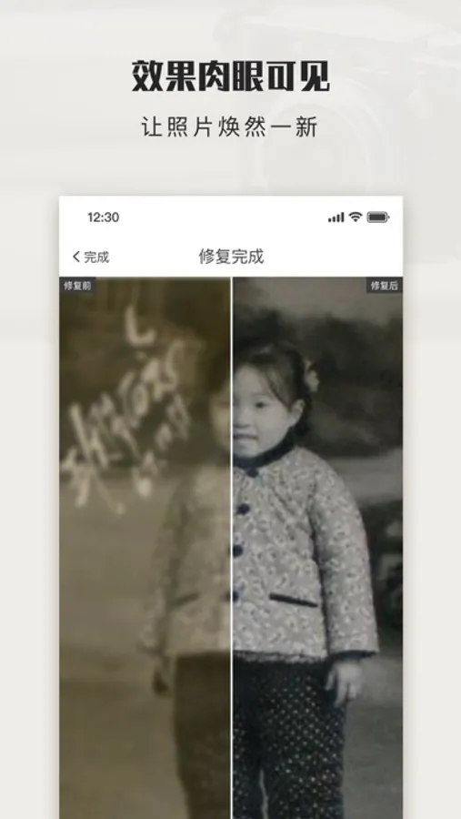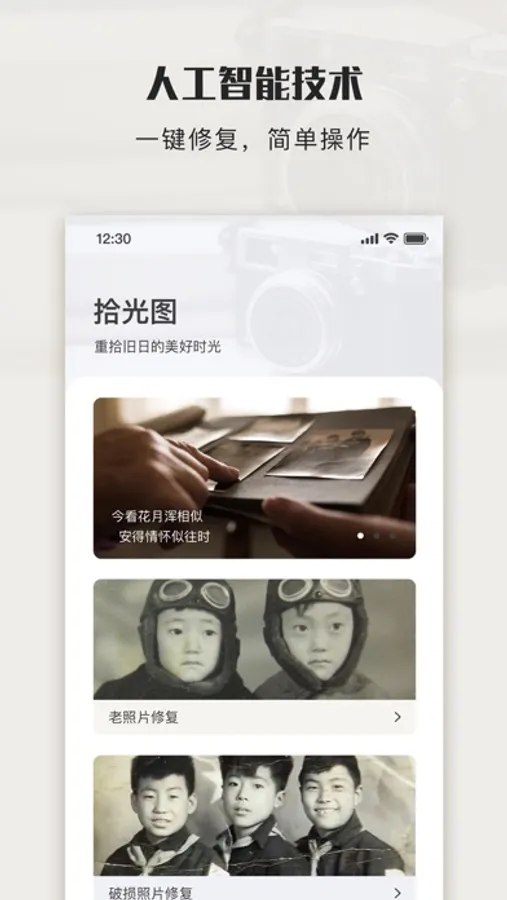 拾光图是一款智能修复模糊破损老照片工具,黑白老照片智能上色,低像素图片无损放大。可以将模糊或已破损的老旧照片通过人工智能技术自动修复照片,让模糊破损的照片变得清晰画质增强。