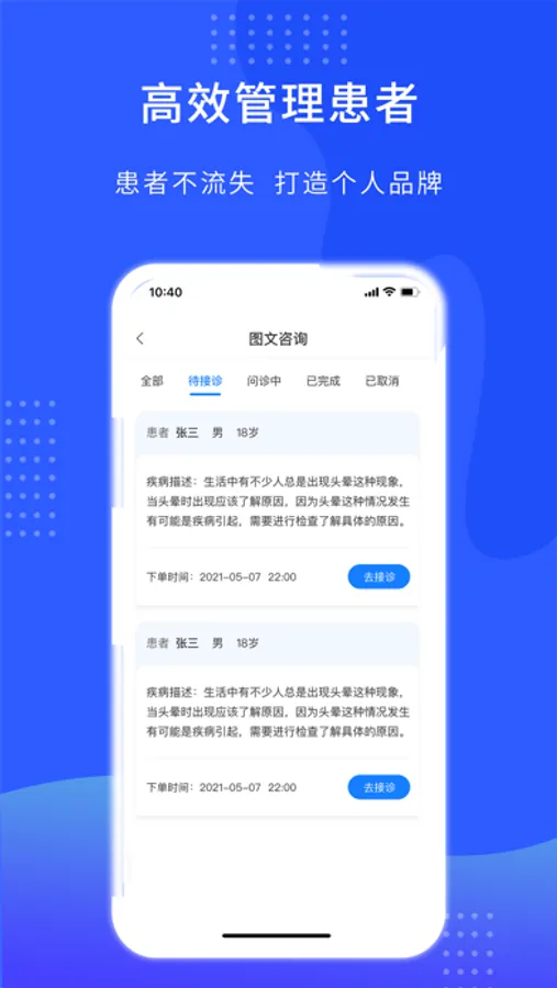 开启执医新方式,多点执业更方便。精准匹配有效患者,吸引患者粉丝群,出诊更方便,碎片时间,随时随地。【专属工作室】——处方单、手术单、诊后管理,在线开单更方便。【患者管理】医生可以对预约挂号、咨询和报到的患者进行管理和诊后随访跟踪病情。【医生专属名片】医生认证后获取专属二维码名片,患者扫码后与医生建立联系,方便患者快速找到医生和购买医生服务,帮助医生建立个人品牌,提升名气。