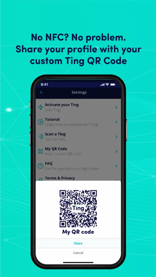 When NFC is not an option, go ahead and show them your own personalized QR Code, which acts exactly like our Ting products. Share it, print it and paste it, anywhere you want.